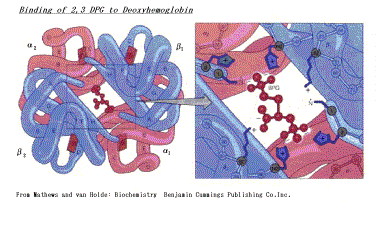 2,3DPGはα鎖の二つのN末端とβ鎖の中間部分に橋をかけるように結合する。