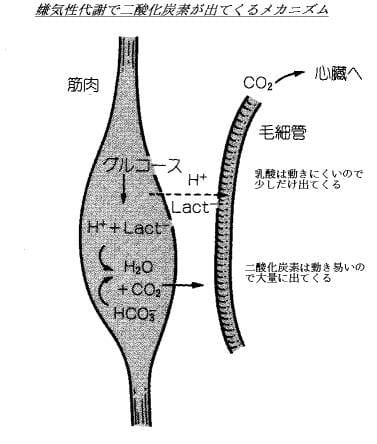 激しい運動では、好気性代謝が間に合わずに嫌気性代謝によって乳酸が生成される。この乳酸が、組織の重炭酸イオンと一緒になって二酸化炭素を産生する。乳酸は荷電があって細胞膜を通りにくいが、二酸化炭素は荷電がなくて通りやすいので、組織や静脈血の二酸化炭素上昇が起りやすい。運動時に、酸素消費量以上に産生された二酸化炭素はこのメカニズムによるものなので、これによって嫌気性代謝の度合いを評価できる。
