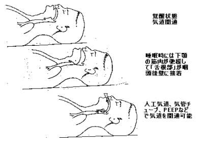 この発生の仕方は麻酔の場合も同様だが、睡眠では覚醒反応で気道閉塞は中断するが、麻酔では覚醒しないので、放置すれば確実に死に至る。