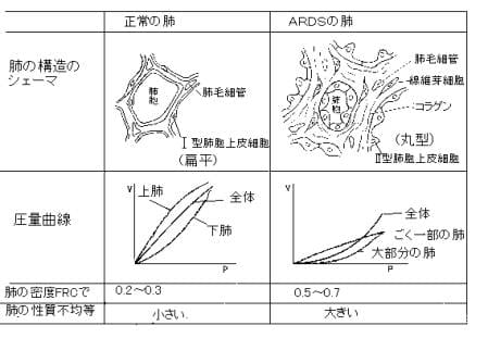 ARDSの肺構造シェーマと圧量曲線:正常肺と比較。