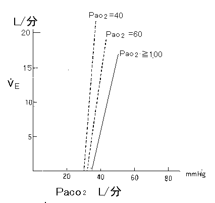 換気の二酸化炭素応答は、図のようにPaco2( またはPAco2 )が上昇すると換気が刺激される反応。