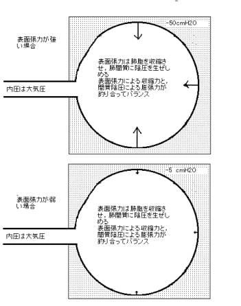 上の図のように表面張力が高いと肺胞の外側は強い陰圧になるので周辺との圧差は大きく、間質の浮腫を招きやすい。下の図のように表面張力が低ければ肺胞の外側の陰圧は小さいので、間質浮腫になりにくい。