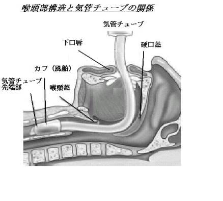 気管チューブ:上の図のように口から声帯を越えて管を入れる。以前は、気管内チューブと読んだが、最近は「気管チューブ」と呼ぶルールになった。
