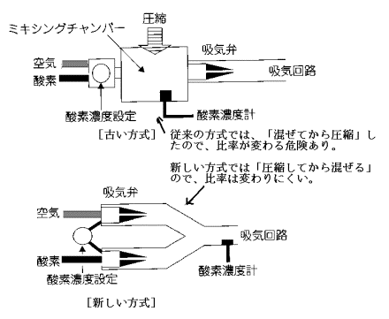 人工呼吸時の吸入気酸素濃度の調整はかなりの厳密さが必要で、最近では図の下の「加圧状態で混ぜる」方式がとられている。このほうが従来の「混ぜてから加圧する」よりも正確で、自由度も高い。
