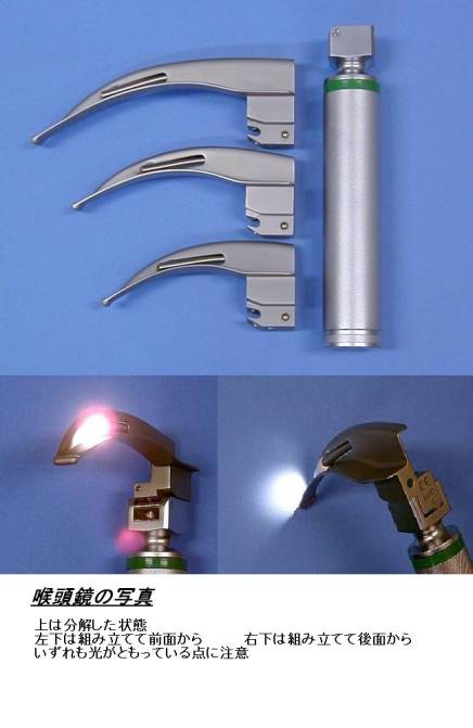 「喉頭鏡」には、耳鼻科の先生方が使用する鏡型のもの(間接喉頭鏡)もあるが、ここは「直達喉頭鏡のこと」