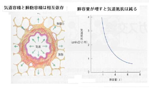 肺が大きく膨らむと気道抵抗は低下する。