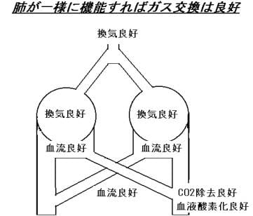 肺が常に一様に機能すればガス交換は良好なのだが、実際にはそうはいかない。この図は二つのユニットがいずれも換気血流比良好な例。
