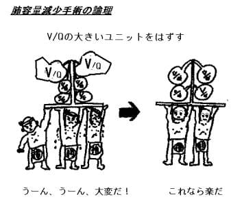 肺容量縮小手術LVRS lung volume reduction surgery :主に肺気腫を対象に、「伸びて弾力のなくなった肺の一部を切除して肺の伸展性を回復させる」ことを狙う手術。VA/Qcの極端な大きな部分つまりブラなどの切除に限れば有効性が高そうである。
