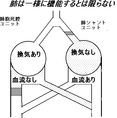 「肺は一様に機能するとは限らない」ことを示す図です。「肺が肺として機能する」には、「肺胞に換気と血流の双方が起る」ことが必須ですが、この図では一方には「換気だけ」、もう一方には「血流だけ」が起っています。こういう肺は、気相と血液相の間にガス交換を達成することができません。