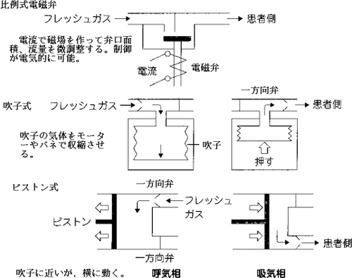 従来は吹子やピストンのものもあったが、長期人工呼吸用の人工呼吸器では電磁弁を使うものが多くなった。「精度」や「耐用性」の他に、「電子回路でコントロールしやすい」のが最大の理由で、他の方式では必ず「制御用の機械メカニズム」が必要だが、電磁弁なら電気的に制御できる。