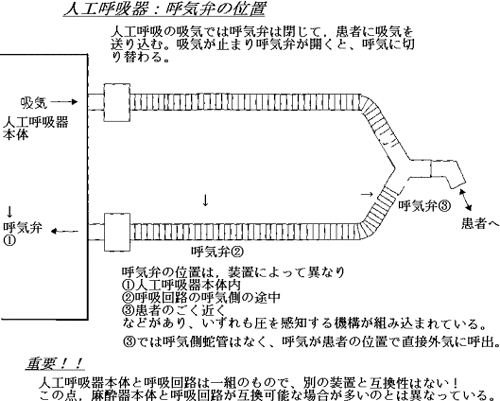 人工呼吸器の吸気では、呼気弁は閉じて肺を膨らませる。吸気は本体内で作られて呼吸回路に送られる。吸気が終わると呼気弁が開いて呼気が始まるが、呼気弁の位置は装置で異なる。