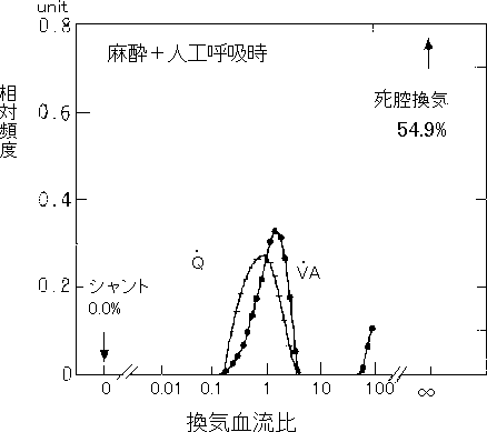 特に、V/Q比10を超えるところに大きなコンポーネントが見られる。これが加わった故に死腔が全体としては55%にもなっている。気道の存在だけでなくて、「血流の極端に乏しい肺のユニットが出現」していることを示している。