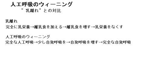 言葉のとおり、人工呼吸に自発呼吸を混ぜながら、次第に自発呼吸部分を多くしていって、最終的に人工呼吸をなくすプロセスを呼ぶ。