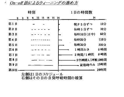 この例では、初日には朝夕5分間ずつ、合計10分間だけ人工呼吸を止め、第10日に完全に