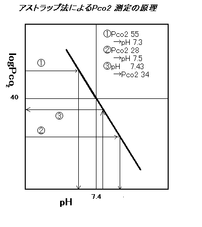 アストラップ法によるPco2は、「対象の血液をPco2既知の2種のガスと平衡させてpH-Pco2関係を確立しておき、血液のpH から内挿でPco2を算出する」方法である。