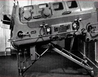 鉄の肺の写真:実際に患者が入っていて、頭の部分が見えているのに注意。