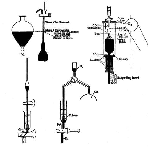 ヴァン=スライクの検量法(左上)と検圧法(右上)、左下は血液の導入法。右下はガスの導入法。