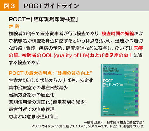 臨床検査技師向けの雑誌には、POCTガイドラインが第3版まで出ており、POCTは日本語では、「臨床現場即時検査」という定義がなされております。その定義についてガイドラインからですが、その最大の利点は“診療の質の向上”であり、内容は図にまとめてあります。