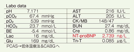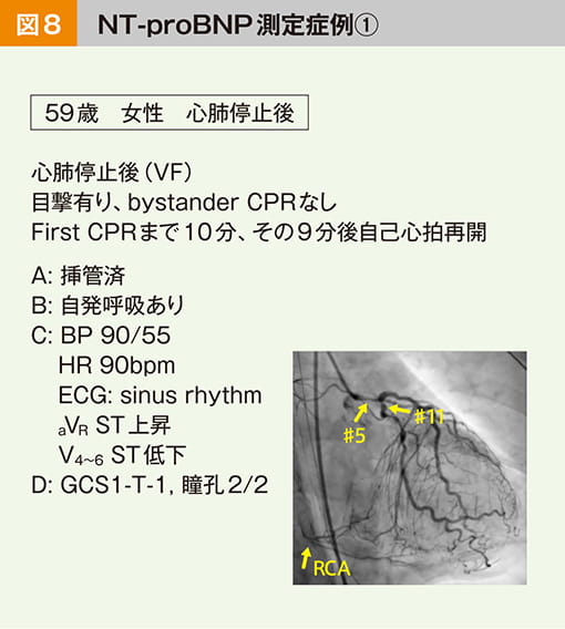 59歳女性、心肺停止後蘇生しましたが、心電図では虚血変化があり、意識も戻りません。血液検査でNT-proBNPは高値を示しており、血管造影などの結果、急性冠症候群でした。