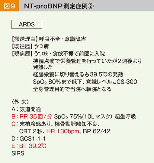 ARDS(急性呼吸促迫症候群)です。つまり呼吸不全ですが、この方は呼吸数が多く、脈拍も速く、熱がありました。この段階でSIRS(全身炎症反応症候群)を満たしています。血液ガスでは乳酸値が36mg/dlと高値です。血液検査値もNT-proBNPの他、CRPやPCTといった炎症反応も上昇していました。