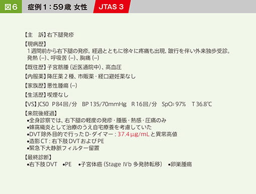 59歳女性で、右下腿発疹から徐々に疼痛が現れ、跛行を伴い救急外来独歩受診されました。JTASは3です。全身診療では蜂窩織炎として治療を行う事を考慮出来ましたが、“消しの診療”でD-ダイマーの適用となりました。結果右下肢のDVT、PE、更に子宮筋腫と言われていたものが子宮体癌である事も分かりました。