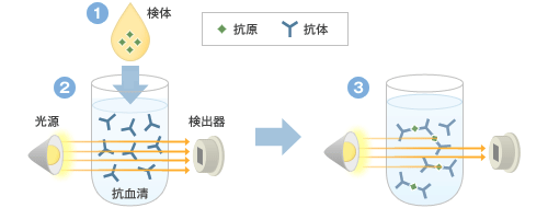 検出しようとする物質(抗原)に特異的な抗血清を用い、標的物質を特異的に検出する液相中で行う測定系である。検出方法は、抗血清を含む試薬中の抗体が抗原物質と免疫複合体を形成することにより発生する濁度を検出する測定系である。CRP、イムノグロブリンの検出等に用いられている。